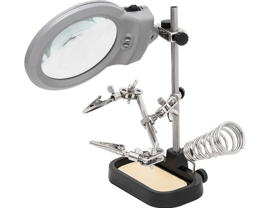 Zestaw narzędzi ułatwiający lutowanie oraz inne precyzyjne czynności instalatorskie i elektroniczne. W podstawie znajduje się gąbka do czyszczenia grotu oraz solidny uchwyt na lutownice. Do wykorzystanie są także dwa uchwyty "krokodylki" oraz szeroka lupa z możliwością podświetlenia. Duże możliwości konstrukcyjne umożliwiają dostosowanie ustawień do własnych potrzeb. Idealnie sprawdzi się rwnież podczas takich pracy jak klejenie lub modelarstwo, wszędzie tam gdzie potrzebna jest precyzja i dokładność.