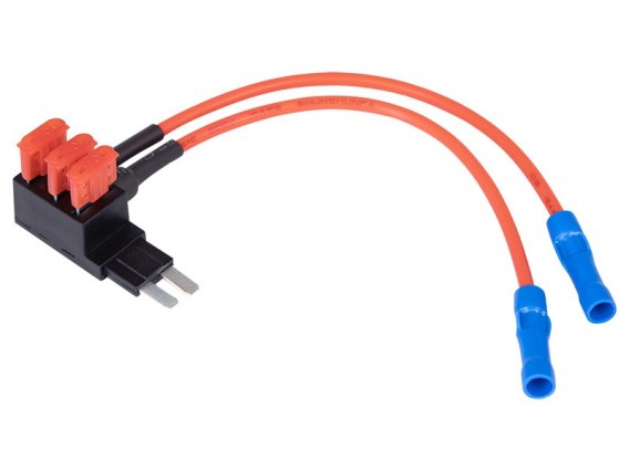 Rozgałęźnik prądowy z trzema bezpiecznikami standard uni 10A (bezpieczniki w zestawie) umożliwia podłączenie do instalacji samochodowej dodatkowego urządzenia, zabezpieczonego bezpiecznikiem.