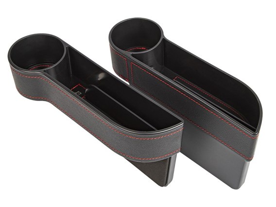 Zestaw dwch schowkw samochodowych szczelinowych z przegrdkami i uchwytami na kubki. Przeznaczone do montażu pomiędzy fotelem, a skrzynią biegw. Wyjątkowo ładne obicie w czarnym kolorze to pewność wpasowania się produktu do każdego wnętrza samochodu, a czerwona nić podkreśla wyjątkowy i nowoczesny design. W przedniej części zamontowany został uchwyt na napoje (kubek, szklankę, puszkę czy butelkę).