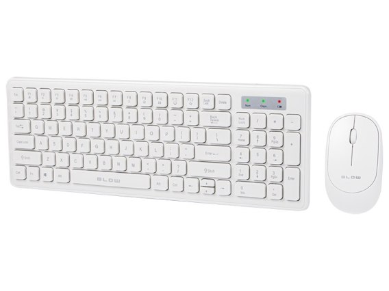 Zestaw marki BLOW składający się z bezprzewodowej klawiatury oraz myszki. Urządzenia łączą się z laptopem lub komputerem za pomocą niewielkiego odbiornika USB. Zestaw charakteryzuję się prostym designem, wygodą pracy oraz łatwym użytkowaniem.
