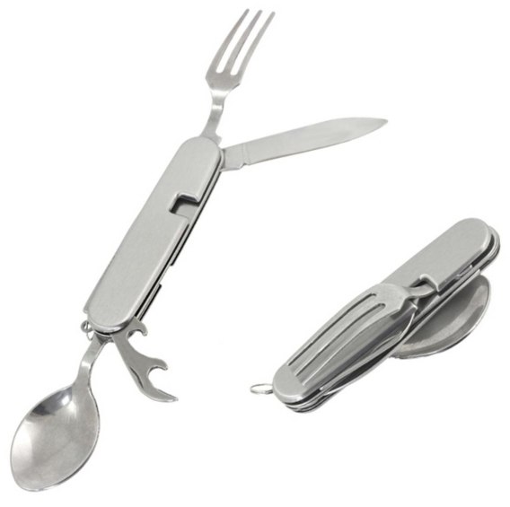 Kieszonkowy niezbędnik wojskowy i turystyczny! Zawiera w sobie nóż, otwieracz do konserw i butelek, widelec oraz łyżkę zintegrowane w jednym poręcznym scyzoryku, który możesz mieć zawsze przy sobie. Zestaw został wykonany z gładko polerowanej, nierdzewnej stali, co zapewnia długie i bezproblemowe użytkowanie. Obowiązkowe wyposażenie każdego turysty wędrowca oraz wszystkich biwakowiczów.