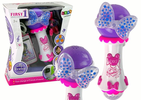 Różowo-fioletowy mikrofon zaprojektowano z myślą o najmłodszych. Ozdobiono go detalami w białym kolorze, dzięki czemu prezentuje się rewelacyjnie. Kokardka i kula, umieszczona w dolnej części zabawi, świecą podczas występu, urozmaicając zabawę. Wielofunkcyjna zabawka pobudza rozwój dziecka na kilku płaszczyznach ? usprawnia słuch, zdolności muzyczne i rytmiczne małej gwiazdy, a także polepsza wyobraźnię, koncentrację i koordynację ruchową.Zestaw składa się z: