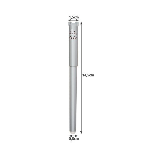 SPECYFIKACJA? materiał: ABS + TPR;kolor: szary/biały/różowy/granatowy; kolor pisania: niebieski; grubość pisania: 0,35 mm; średnica gumki 0,8 cm; wymiary: 14,5 x 1,5 cm; waga: 0,033 kg; waga w opakowaniu: 0,039 kg.