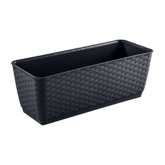 Prostokątna doniczka z fakturą imitującą plecionkę rattanową. Wersja z praktyczną przekładką do prawidłowego nawadniania roślin. Wydłuża czas, w którym ziemia jest wilgotna. Pozwala zaoszczędzić wodę przez mniejsze odparowanie.