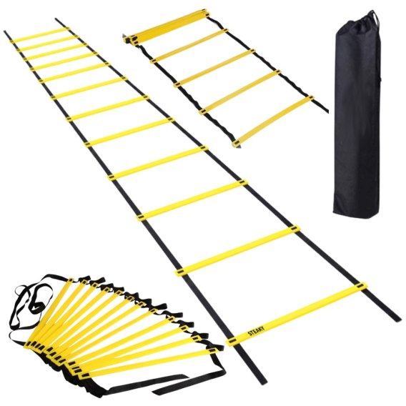Zestaw zawiera praktyczny pokrowiec, który zabezpiecza drabinkę podczas przechowywania i transportu, zapobiegając jej plątaniu się z innym sprzętem. Drabinka łatwo się rozkłada i nie zajmuje dużo miejsca, dzięki czemu może być używana na boiskach, w ogrodzie, na siłowni czy hali sportowej.