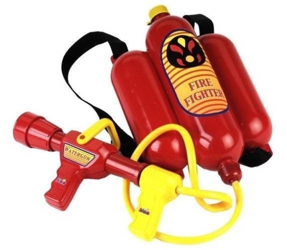 Gaśnica plecakowa to jeden z hitów tej serii. Wykonana bardzo solidnie z grubego tworzywa. Całość oczywiście w kolorze czerwonym (który najbardziej kojarzy się ze strażakami) z żółtymi dodatkami. Do zbiornika, który dziecko zakłada na plecy, można nalać wody i za pomocą pistoletu połączonego wężykiem ze zbiornikiem gasić pożar wodą! Czy może być większa frajda?