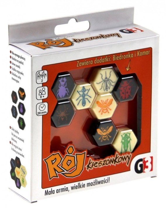 Rój jest grą logiczną dla 2 graczy. Celem gry jest otoczenie królowej przeciwnika. Każdy gracz ma 13 płytek przedstawiających 7 różnych owadów. Gracze wykonują swoje ruchy na zmianę. W swoim ruchu mogą albo dołożyć owada do roju, albo przesunąć jedną z wcześniej zagranych płytek. Każda płytka posiada unikalny sposób poruszenia (jak w szachach) naśladujący ruch przedstawionego na niej owada. Na przykład, konik polny jest jedynym owadem potrafiącym przeskakiwać inne płytki. Proste reguły i ogromna ilość dostępnych kombinacji sprawiają, że Rój jest prawdziwym wyzwaniem dla graczy ceniących sobie intelektualną rozrywkę. Gracze muszą wykazać się umiejętnościami strategicznego planowania, taktycznego myślenia i wyobraźni przestrzennej. Kluczem do zwycięstwa jest sprytne atakowanie królowej przeciwnika i pozostawienie wystarczających odwodów do obrony własnej. Elegancka torba służąca do przechowywania płytek sprawia, że grę łatwo się przenosi i przechowuje, a niewielkie rozmiary i brak planszy umożliwiają rozgrywkę praktycznie w każdym miejscu. Poprowadź swój rój do zwycięstwa! Rój został uznany przez MENSA za najlepszą grę umysłową 2006 roku! Inne rekomendacje są zbędne! Ta kieszonkowa edycja gry zawiera mniejsze, bakelitowe płytki owadów. W zestawie znajduje się też Komar i Biedronka.