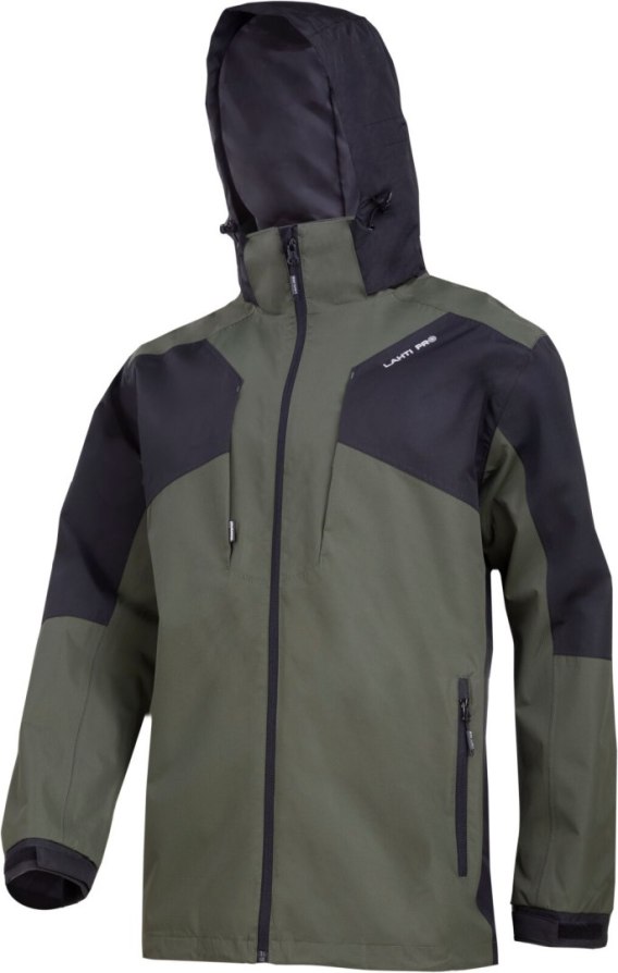 Kurtka: wodoodporna tkanina (2000 mm) typu rip-stop pokryta PVC, wytrzymała i odporna na uszkodzenia mechaniczne, podpinka: impregnowana tkanina zabezpieczająca przed wsiąkaniem wody