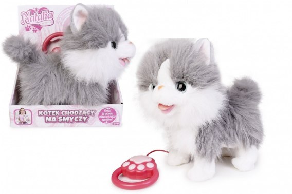 Maskotka interaktywna kot chodzący na smyczy szaro-biały