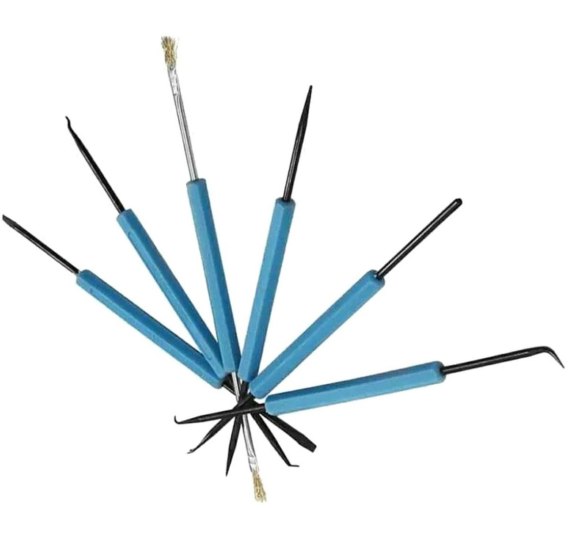 Zestaw sześciu narzędzi do czyszczenia i podważania elementów elektronicznych. Doskonale sprawdzi się podczas prac serwisowych, gdzie wymagana jest wielka precyzja. Świetnie nadaje się do otwierania obudów różnych urządzeń. Długie i wygodne rączki każdego narzędzia ułatwiają pracę i gwarantują pewny chwyt. Każde z narzędzi posiada dwie końcówki, co daje aż 12 zróżnicowanych narzędzi (skrobaków, haczyków i drapaków).