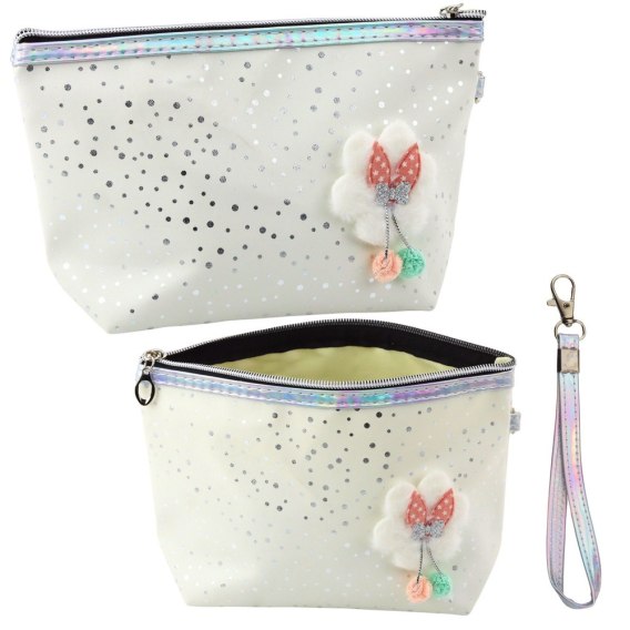 Stylowy i funkcjonalny piórnik-kosmetyczka w kolorze białym z brokatowym wykończeniem to praktyczny dodatek zarówno do szkoły, jak i na co dzień. Dzięki uniwersalnej formie świetnie sprawdzi się jako piórnik na przybory szkolne lub kosmetyczka do przechowywania drobnych akcesoriów. Został wyposażony w solidny zamek błyskawiczny i poręczny uchwyt z karabińczykiem, który umożliwia wygodne przypięcie do plecaka lub noszenie na nadgarstku.