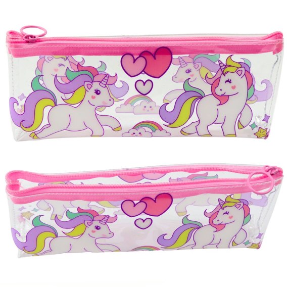 Uroczy piórnik dziewczęcy z motywem jednorożców to idealny dodatek do szkolnej wyprawki każdej małej księżniczki. Transparentna obudowa z kolorowymi jednorożcami, serduszkami i gwiazdkami sprawia, że piórnik przyciąga wzrok i zachwyca swoim bajkowym wyglądem. Delikatny różowy zamek błyskawiczny doskonale komponuje się z pastelową kolorystyką, nadając całości wyjątkowego uroku.