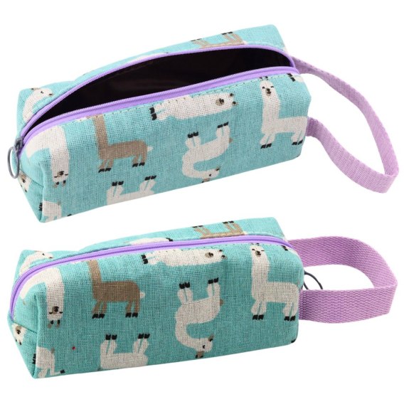 ? Wymiary: ok. 20 x 8,5 x 6,5 cm ? Materiał: tkanina tekstylna ? Kolor: turkusowy z motywem lam, fioletowy suwak i uchwyt