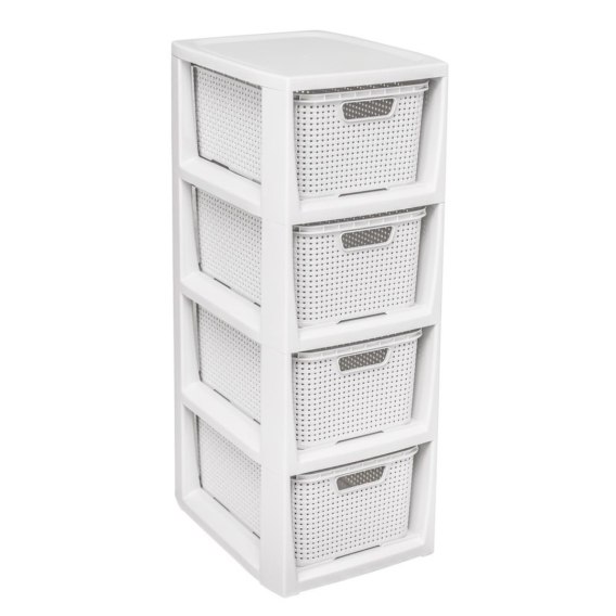 Regał Rattan w kolorze antracyt z 4 koszykami, które pełnią formę szuflad to praktyczny sposób na przechowywanie niezbędnych akcesoriów w łazience, sypialni czy garderobie. Wykonany został z wysokiej jakości tworzywa odpornego na wilgoć. Lekka konstrukcja regału ułatwia jego przenoszenie. Powierzchnia koszyków przypomina wyglądem plecionkę rattanową. Gładka powierzchnia wewnątrz szuflady nie zahacza (nie niszczy) ubrań. Bardzo łatwy do utrzymania w czystości, wystarczy przetrzeć wilgotną ściereczką.