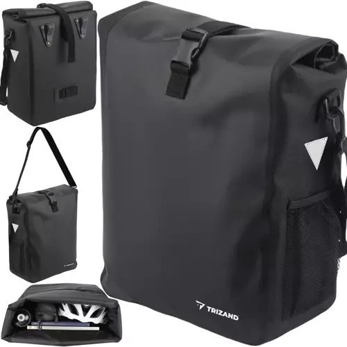 WODOODPORNOŚĆ + BEZPIECZEŃSTWO - torba została wykonana została z wodoodpornego i bardzo mocnego materiału poliester + PVC więc doskonale zabezpieczać będzie nawet ciężkie przedmioty także w trakcie niekorzystnych warunków atmosferycznych. Po bokach sakwy znajdują się dodatkowe odblaski zwiększające widoczność użytkownika po zmroku.