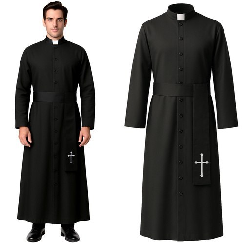Klasyczny strój duchownego z czarną sutanną z koloratką oraz wiszący krzyż togotowe przebranie, które świetnie sprawdzi się na Halloween, balu kostiumowym i przedstawieniu. Luźny krój i rozmiar XL/XXL zapewniają wygodę noszenia. Stylizacja przyciąga spojrzenia i nadaje charakter każdej imprezie.
