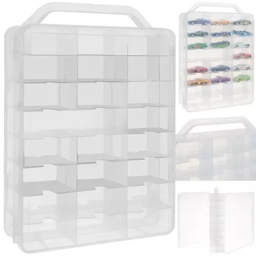 DWUSTRONNA? walizka jest wyposażona z dwóch stron w drzwiczki, a z każdej ze stron po 23 miejsca na samochodziki. Drzwiczki są zamykane na zaciski, dzięki temu autka nie wypadną.