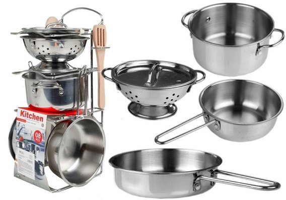 Wieloelementowy zestaw akcesoriów kuchennychZabawa z dom jest jedną z najpopularniejszych rozrywek zauważalnych wśród dzieci. Pozwala na tworzenie przeróżnych, oryginalnych scenariuszy ? dzieci mogą wcielać się w wybrane przez siebie role, do czego potrzebują przeróżnych akcesoriów ułatwiających zabawę. W zbiorach dzieciaków znajdują się między innymi kuchnie, naczynia, sztućce i artykuły spożywcze.Prezentowany przez nas zestaw składa się z błyszczącej, metalowej, srebrnej zastawy, w skład której wchodzą między innymi garnek, patelnie czy cedzak. Mnogość elementów pozwala na wesołą zabawę, podczas której maluchy mogą udawać, że przygotowują wyśmienite potrawy, a także serwować je swoim rodzicom, a także misiom i lalkom.W zestawie znajdują się:- cedzak- garnek- patelnia do grillowania,- patelnia,- drewniana łyżka i widelec- Stojak na naczyniaWszelkie produkty rozmiarem dostosowane są do wymiarów rączek małych dzieci. Elementy te są bardzo lekkie, dzięki czemu zabawa nie będzie sprawiać maluchom najmniejszego kłopotu. Kolorystyka wszystkich elementów zestawu nawiązuje do ich realnych odpowiedników, co z pewnością przyciągnie wzrok każdego małego kucharza. Bezpieczna konstrukcja naczyń i jedzenia jest gwarancją bezpieczeństwa płynącego z zabawy.Wszelkie elementy wykonane są z bezpiecznych materiałów. Zestaw jest zgodny z normą EN 71. Przeznaczony jest dla dzieci powyżej 3. roku życia. Zestaw akcesoriów kuchennych ustawiony jest na przeznaczonym dla nich stojaku.Wymiary wybranych elementów zestawu:- cedzak : 5,5cm x 16cm- garnek: 5,5cm x 16cm- patelnia: 5,5cm x 20cm- Wysokość stojaka : 33cm