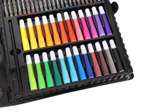 168 ELEMENTÓW ?przy pomocy ogromnego wyboru 24 kredek, 24 mazaków, 48 pasteli olejowych, 48 pasteli świecowych, 12 farb akwarelowych, temperówki, kleju, korektora, ołówka, gumki do mazania, kartek a4z łatwością stworzymy najbardziej wymyślne, kreatywne i oryginalne prace.