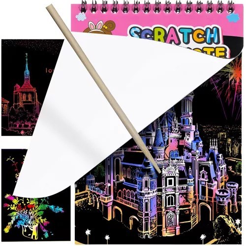 Zestaw kartek do zdrapywania to nowoczesna forma zabawy uruchamiająca u dziecka wyobraźnię już od najmłodszych lat. Sprawi ona, że Twoje dziecko rozwinie kreatywność oraz zdolności manualne. Będzie to świetna alternatywa dla zwykłego rysowania kredkami. Zabawa polega na wydrapywaniu wierzchniej, czarnej powłoki w taki sposób aby powstał obrazek. Maluch ma nieograniczone możliwości w tworzeniu kształtów oraz rysunków, które z pewnością będą o wiele ciekawsze od tych standardowych. Kartki zdrapywanki są małe i przenośne, co czyni je łatwymi do zabrania ze sobą np. w podróż.