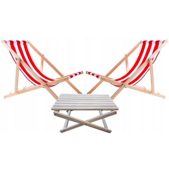 Zestaw dwóch leżaków drewnianych z białym materiałem w czerwone pasy + stolik kawowy, będzie doskonałą propozycją do każdego ogrodu lub na plażę. Stolik jak i leżaki składają się, dzięki czemu możesz zestaw zabrać wszędzie ze sobą nawet na wakacje!